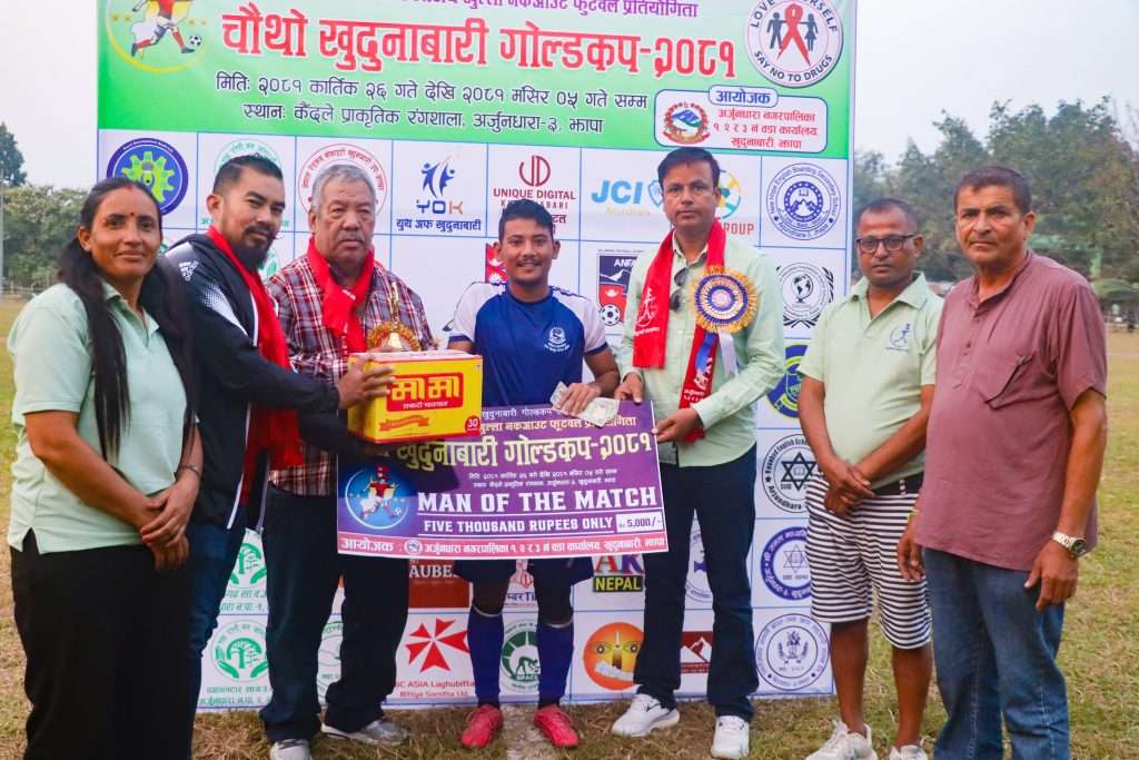 मेचीनगरकालागि ४ गोल गरेका सनम भुजेल खेलको ‘म्यान अफ दि म्याच’ घोषित भए । उनले नगद ५ हजार र ट्रफि पुरस्कार पाए । उनलाई प्रतियोगिताका संयोजक सिताराम भट्टराई, प्रमुख अतिथि मदन बिक्रम नेम्वाङ र नगर खेलकुद विकास समिति अर्जुनधाराका अध्यक्ष सुरेन्द्र धिमालले पुरस्कार प्रदान गरे ।