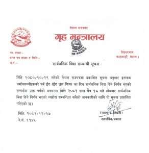 ईद पर्वमा सार्वजनिक बिदा दिने नेपाल राजपत्रमा प्रकाशित सूचनाअनुसार सोमबार सार्वजनिक विदा दिने निर्णय भएको गृह मन्त्रालयले जनाएको छ ।