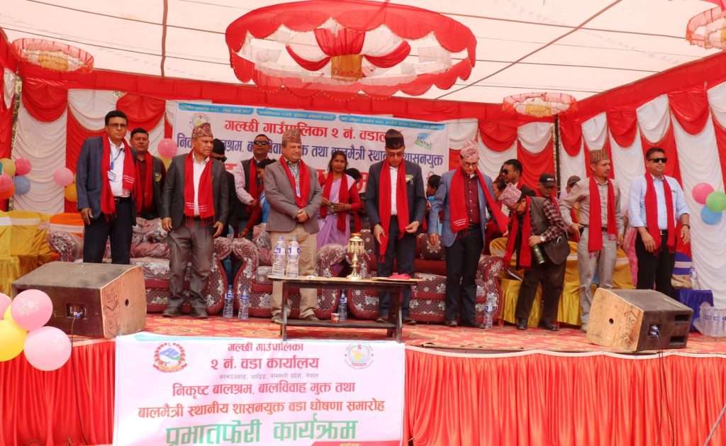 धादिङ – धादिङ जिल्लाको गल्छी गाउँपालिका–२ औपचारिक रूपमा बालमैत्री स्थानीय शासनयुक्त वडा घोषणा गरिएको छ । बालमैत्री स्थानिय शासन घोषणा कायविधि २०७९ ले निर्दिष्ट गरेका ५१ वटा सुचक पूरा गरेपछि वडालाई बालमैत्री स्थानीय शासनयुक्त वडा घोषणा गरिएको हो ।