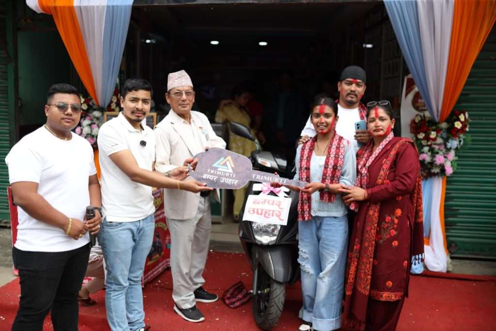 धादिङको जिल्ला सदरमुकाम धादिङबेसी मिलनटोलमा रहेको त्रिमुर्ती मोबाईल हाउसले २०८१ सालमा मोबाईल खरिद गर्ने ग्राहकहरु मध्येबाट एक जनालाई लक्की ड्र मार्फत स्कुटर प्रदान गरेको हो । मोबाईल किन्दा स्कुटर जित्दा खुसी लागेको स्कुटर विजेता सजिना बताउँछिन् । `एसइई दिएर बसेको थिएँ । अफरमै २०८१ साल चैत १८ गते त्रिमुर्ती मोबाईल हाउसमा मोबाईल किनेँ । अहिले स्कुटर जितेँ खुसी छुँ´ उनले भनिन्- `एउटा मोबाईल किन्दा स्कुटर जितेँ, यो वर्ष मैले जितेँ । तपाईं पनि त्रिमुर्ती मोबाईल हाउस आएर मोबाईल किन्नुस्, अर्को पटक स्कुटर जित्ने पालो तपाईको हो ।´