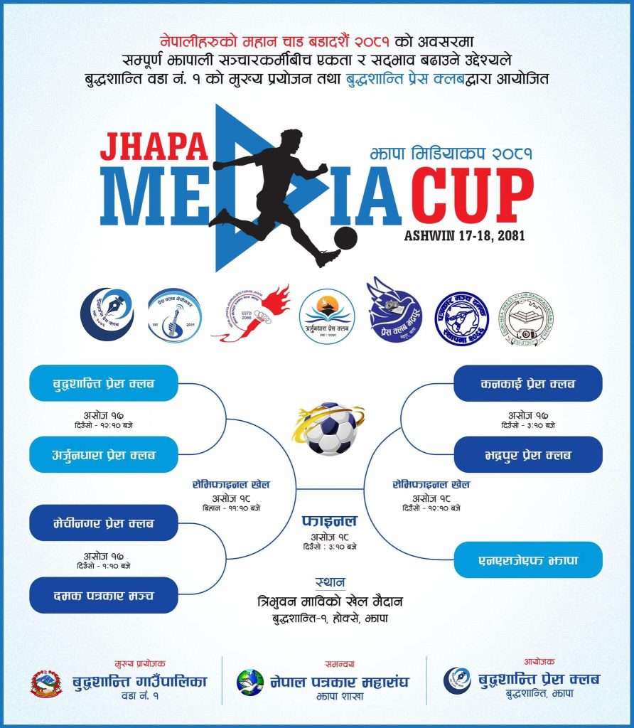 झापा ।। बुद्धशान्ति प्रेस क्लबले आयोजना गर्ने झापा मिडिया कप २०८१ को खेल तालिका सार्वजनिक गरिएको छ । आयोजक बुद्धशान्तिसहित अर्जुनधारा, मेचीनगर, कनकाई र भद्रपुर प्रेस क्लबले प्रतिस्पर्धा गर्ने छ । त्यस्तै पत्रकार मञ्च दमक र खेलकुद पत्रकार मञ्च झापा सहभागी हुनेछन् ।